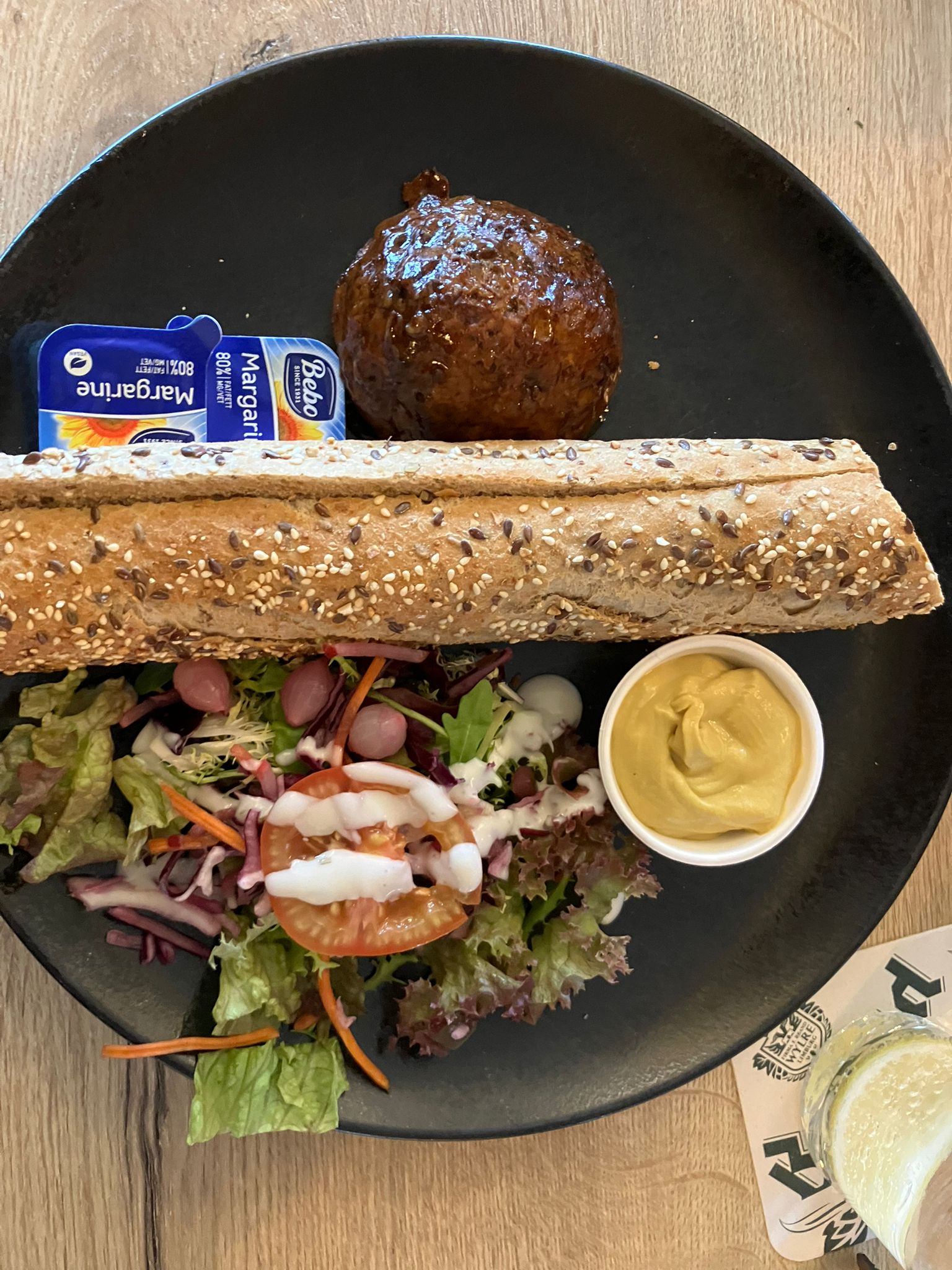 Tot onze verrassing was de bestelde čn supervlot gebrachte bal met een lekker knapperig stokbroodje geflankeerd door superverse sla meer dan voldoende om onze meestal stevige lunch-trek te bevredigen.
