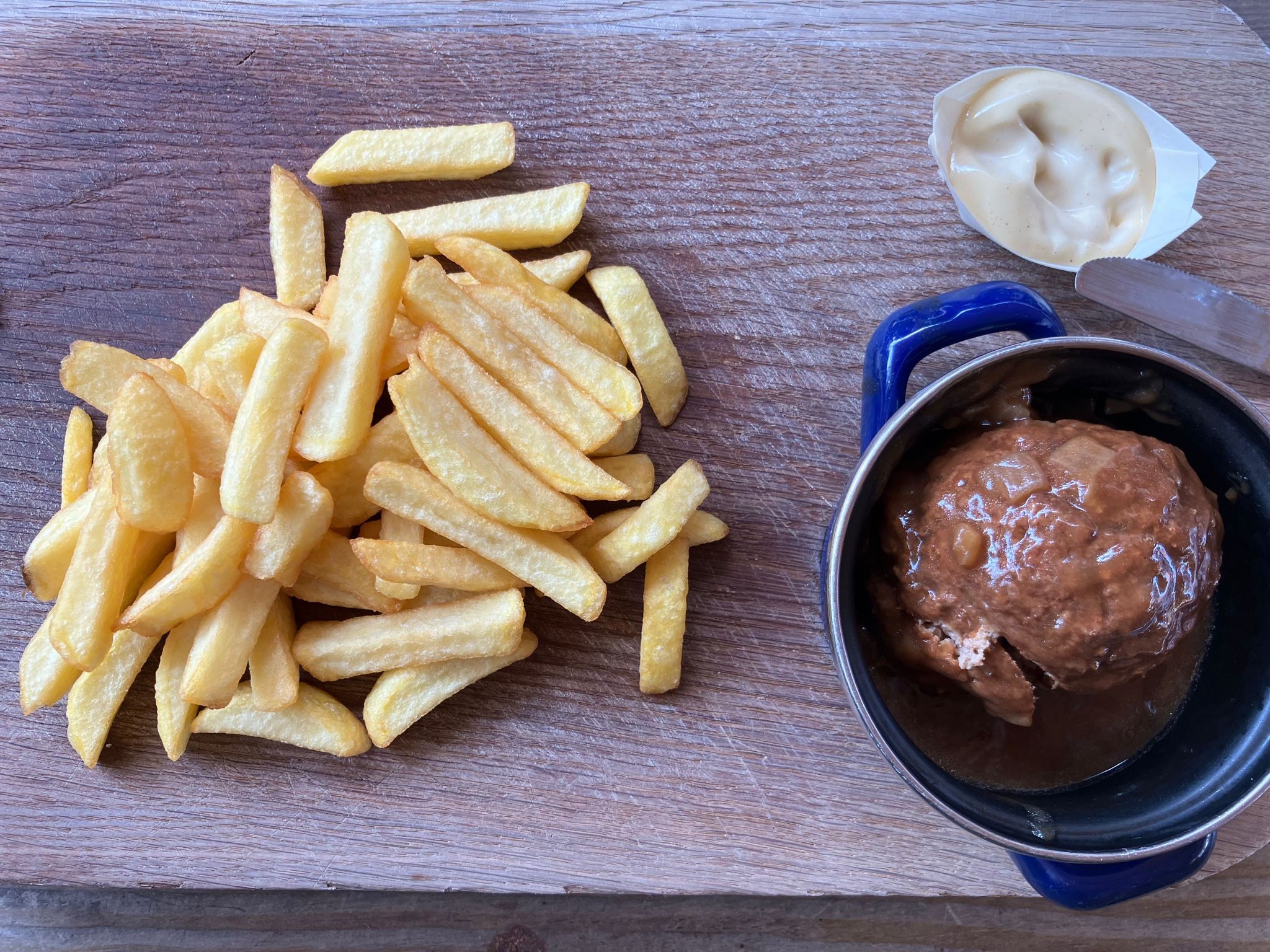 Na een relatief korte wachttijd werden onze ballen geserveerd op mooie eikenhouten planken. De bal zat in een nogal klein pannetje (of was de bal te groot?) samen met lekker frietjes en mayonaise. Het pannetje liet helaas weinig ruimte om de bal open te leggen en beter te "genieten".