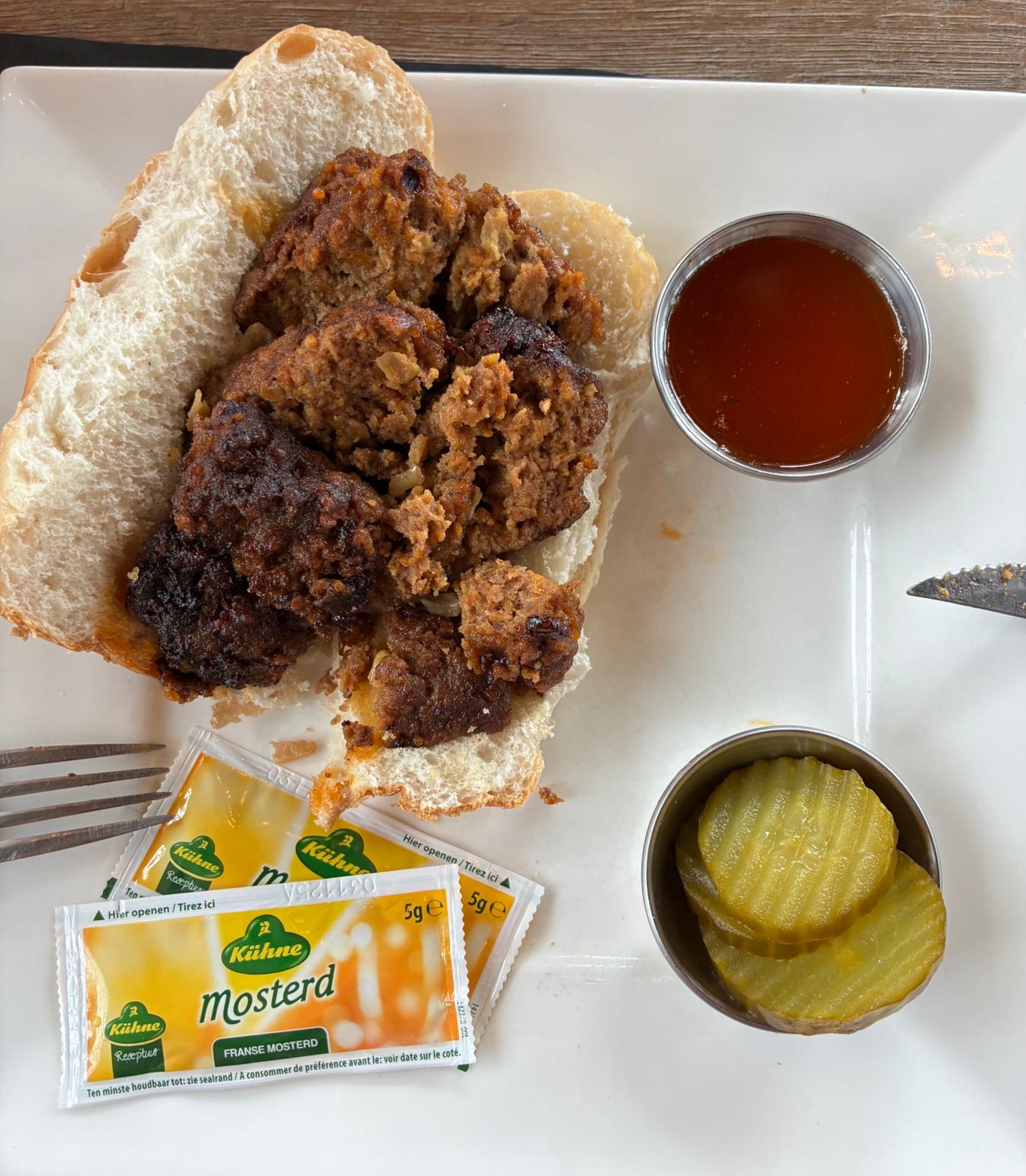 We hadden de on-line menukaart bestudeerd, dus direct na het bestelde drankje konden we laten weten dat we graag allebei het broodje bal wilden gaan nuttigen.