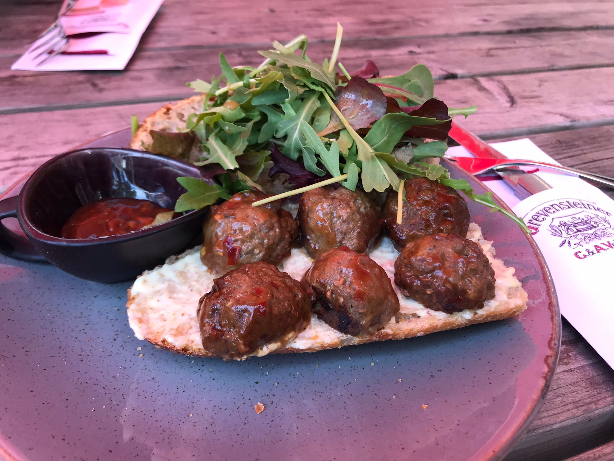 De presentatie van de wilde ballen was een verrassende variatie op wat we gewoonlijk zien: Géén grote bal aan een stuk, maar drie parmantige balletjes, gekliefd en op een knapperig stokbroodje. Een bakje pittige saus en wat Rucola maakten het geheel compleet.